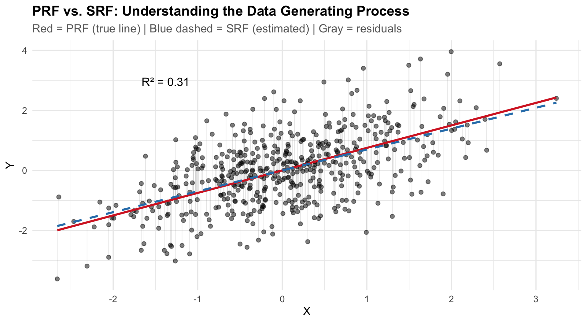 PRF (red solid): \(Y_i = \alpha + \beta X_i + \epsilon_i\) — the true line we never see